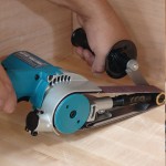 Versatile for use on wood, metal, and fiberglass materials. Ideal for woodworkers, artists, glaziers, welders, prefinished cabinet installers, and finish carpenters. Narrow belt and exposed front pulley for use in close quarters or on irregular shapes. Variable speed control dial (656-3,280 ft./min.) enables user to match the speed to the application. Lock-on button for continuous operation. Compact with less weight (4.6 lbs.) for use in close quarters work with excellent manueuverability. Multi-position side handle for easy and comfortable operation. Ball and needle bearing construction for smooth operation and longer tool life. Connects to dust collector for a cleaner work environment. Includes 10 abrasive belts.